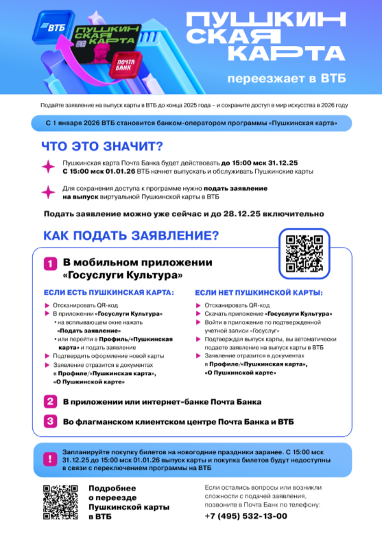 ❗Внимание! Пушкинская карта переезжает в ВТБ❗ Рассказываем, как сохранить доступ в мир истории и искусства💫 С 1 января 2026 года ВТБ становится банком-оператором государственной программы «Пушкинская карта». ❓Что это значит?