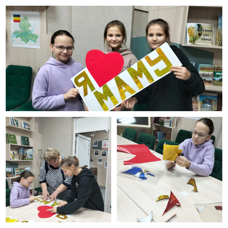 В последнее воскресенье ноября мы говорим слова любви и благодарности самым главным людям в нашей жизни – нашим мамам. Что может быть трогательнее, чем подарок, созданный руками детей? В преддверии праздника в нашей библиотеке прошёл мастер – класс по изготовлению тематической фото зоны «Я люблю маму», около которой можно запечатлеть положительные эмоции и сделать красивые снимки на память.