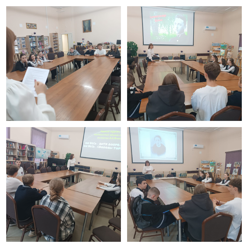 В преддверии знаменательной даты, 28 ноября, когда исполняется 145 лет со дня рождения Александра Блока, в Целинской центральной библиотеке прошел час поэзии «Александр Блок — поэт серебряного века». Для ребят 8-В класса СОШ № 1 библиотекари провели увлекательную встречу, посвященную поэту, которого по праву называют душой и голосом самой изысканной и трагичной эпохи русской литературы.