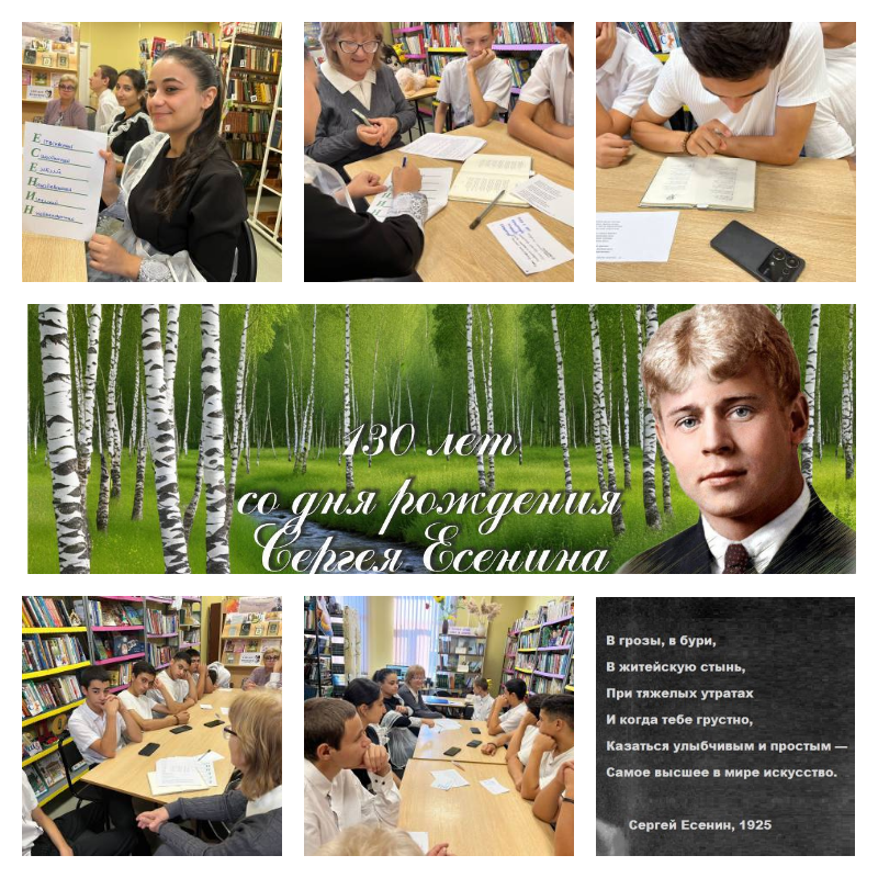 2 октября 2025 года в библиотеке прошел литературный час «Читая Есенина», посвящённый жизни и творчеству великого русского поэта. Мероприятие началось со стихотворения А. Ахматовой «Памяти Сергея Есенина». Заведующий библиотекой Семенова Е.Ю. рассказала ребятам о детских годах жизни поэта, его семье и удивительном крае — Рязанской земле, познакомила с интересными фактами из жизни юного Сергея Есенина.