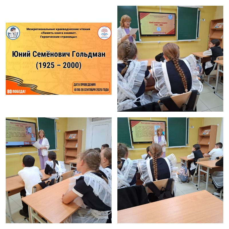 10 сентября 2025 года мы приняли участие в третьем этапе межрегиональных краеведческих чтений «Память книга оживит. Героические страницы», который посвящён творчеству Юния Гольдмана. Для этого мы присоединились к прочтению отрывка из рассказа «Отзыв: «Победа». Юний Семенович Гольдман - журналист, поэт, прозаик. Родился 15 июня 1925 г. в Киеве. Умер 14 ноября 2000 г. в Ростове-на-Дону. В Союз писателей СССР был принят в 1958 г.