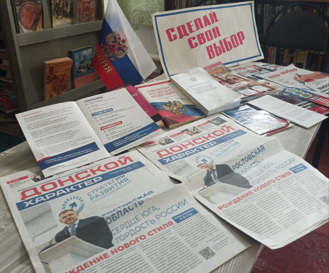 В преддверии выборов Губернатора Ростовской области в библиотеке работает тематическая информационная выставка «Сделай свой выбор»На выставке представлен материал, посвященный истории и современности избирательного права, рассказывающие об избирательном процессе в России и на Дону. Посетители могут подробно изучить материалы, касающиеся подготовки и организации избирательных кампаний, познакомиться с действующими механизмами функционирования современной избирательной системы России и особенностями технологий, используемых в ходе голосования.В ходе предвыборной компании выставка будет пополняться статьями из периодических изданий.