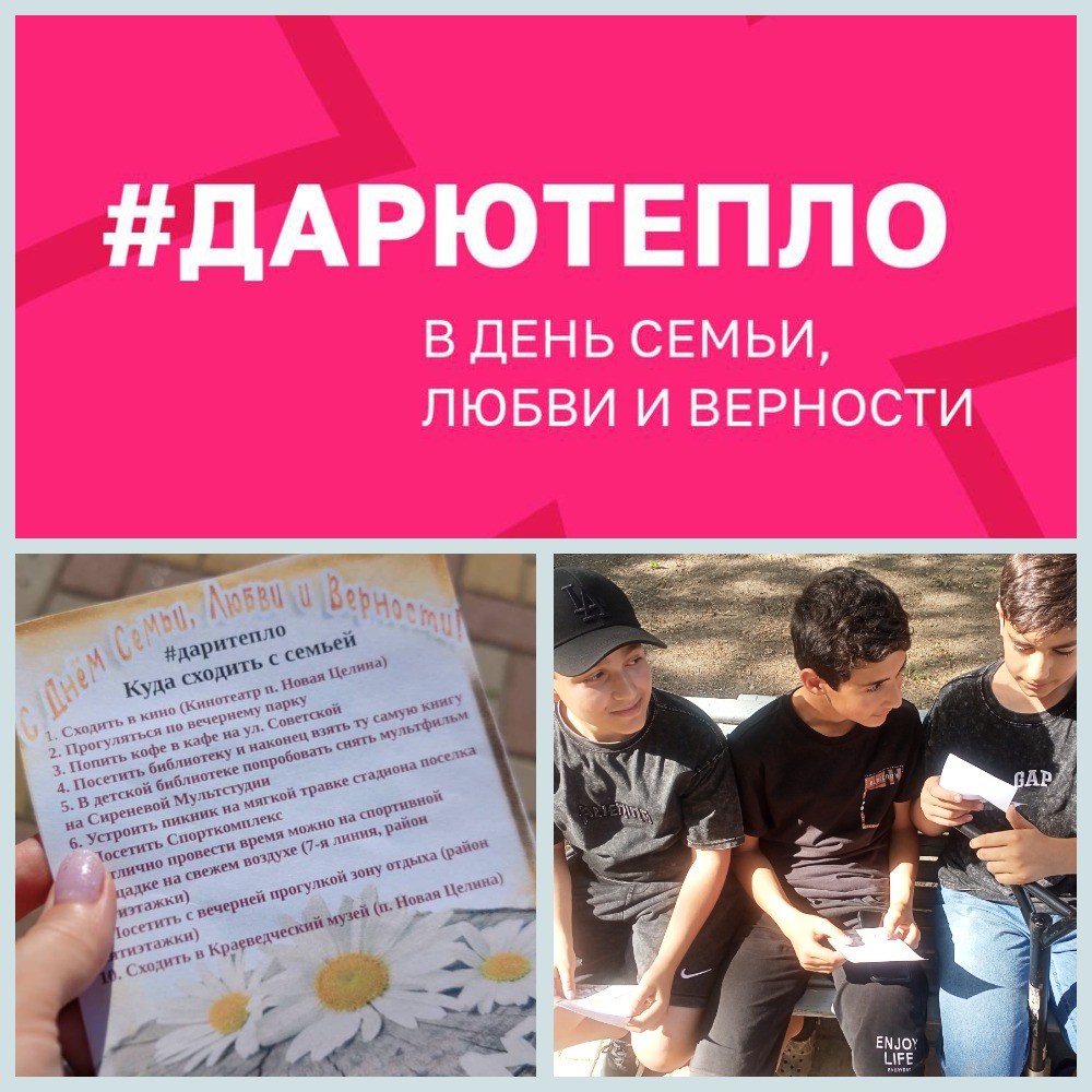 В День семьи, любви и верности, Детская библиотека присоединилась к проведению Всероссийской акции #Дарютепло. Сотрудники библиотеки Лебешева О.Н. и Лысакова Н.В. вместе с маленькими читателями согласно условиям акции знакомили жителей и гостей поселка с общественными местами, интересными и доступными для проведения времени в кругу семьи. Ребята заранее подготовились к прогулке: обсудили и составили список из 10 пунктов «маршрутного листа выходного дня». В ходе беседы с участниками акции выяснилось, что не все варианты семейного отдыха известны целинцам: пикник на мягкой травке Стадиона и поход в Музей очень заинтересовали как взрослых так и деток.