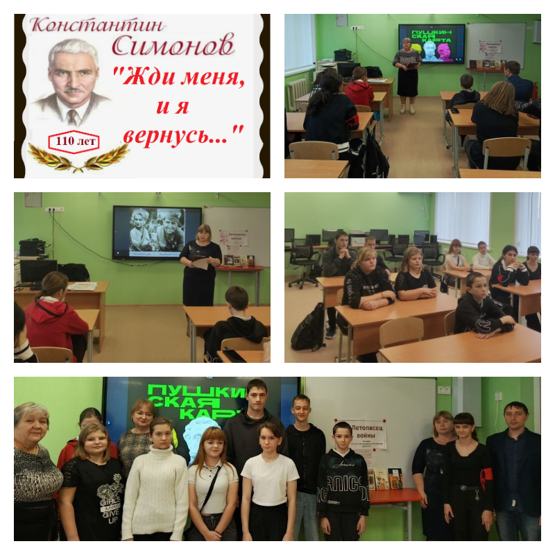 В рамках проекта «Пушкинская карта» сотрудниками Журавлёвской сельской библиотеки был проведён литературно-поэтический час «Жди меня, и я вернусь…», посвящённый 110-летию со дня рождения Константина Михайловича Симонова — выдающегося советского писателя, поэта, драматурга и журналиста. К мероприятию вниманию школьников была организована книжная выставка «Летописец войны», на которой представлены произведения писателя, литература о его жизни и творчестве.