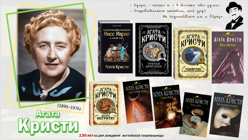 15 сентября исполнилось 135 лет со дня рождения английской писательницы и драматурга, «королевы детектива», Агаты Кристи. Произведения Агаты Кристи – одни из самых публикуемых за всю историю человечества. Ее произведения Агаты переведены более чем на 100 языков мира, а тираж изданных книг давно перевалил за 4 млрд экземпляров. Из-под пера писательницы вышли более 60 детективных романов, 19 сборников рассказов, 6 психологических романов (правда, их она писала под другим псевдонимом – Мэри Уэстмакотт), пьесы, автобиографические произведения.