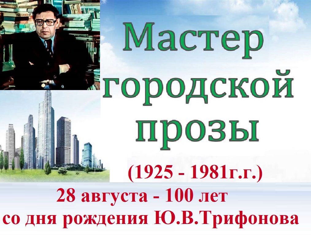 28 августа – 100 лет со дня рождения русского советского писателя Юрия Валентиновича Трифонова. Юрий Валентинович Трифонов - одна из главных фигур литературного процесса 1960—1970-х годов в СССР, его называли мастером «городской» прозы. Родился писатель в Москве 28 августа 1925 года.