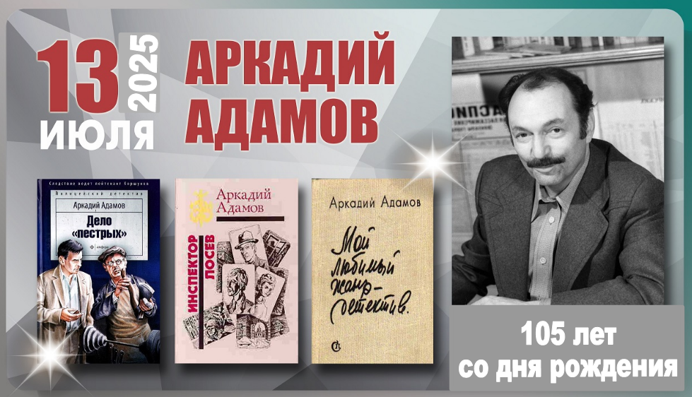 13 июля исполняется 105 лет со дня рождения А.Г. Адамова (1920-1991). Арка́дий Григо́рьевич Ада́мов (13 июля 1920 — 26 июня 1991) — русский советский писатель, автор детективов. Сын известного писателя-фантаста Григория Адамова. Его повесть «Дело „пёстрых“», вышедшая в 1956 году, стала первым широко известным отечественным детективом, благодаря чему в стране в 1950-х годах произошло возрождение детективного жанра. По этой книге в 1958 году режиссер Николай Досталь поставил одноименный фильм. Основным персонажем книг Адамова сначала являлся сотрудник МУРа Сергей Коршунов, а в поздних произведениях — ученик Коршунова Виталий Лосев. Адамов — автор документальных записок «Мой любимый жанр — детектив» и ряда исследований по зарубежной детективной литературе.